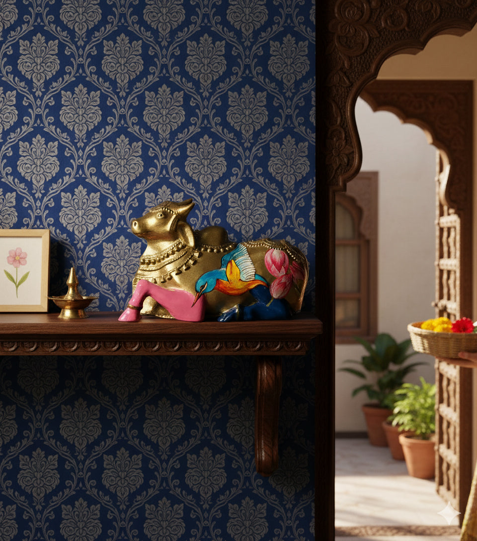 Nandi – Artistic Hand-Painted Gond Art Sculpture Celebrate the charm of Indian folk tradition with our exquisite Nandi sculpture, a unique piece of Gond artistry brought to life through vibrant hand-painted designs. This version of Nandi stands out with a beautiful golden finish, adorned with intricate motifs including a colorful bird in flight and delicate lotus flowers, symbolizing prosperity, spirituality, and harmony with nature. Perfectly blending cultural symbolism with artistic creativity, this handcrafted piece is ideal for adding a splash of tradition and color to any home, office, or sacred space. Compact yet striking, the Nandi sculpture serves as a wonderful decorative accent, a thoughtful gift for art lovers, or a spiritual keepsake that connects you to India's rich artistic heritage. Embrace folklore, artistry, and craftsmanship in one elegant creation. Dimensions: 2.3" x 2.7" x 4.3"